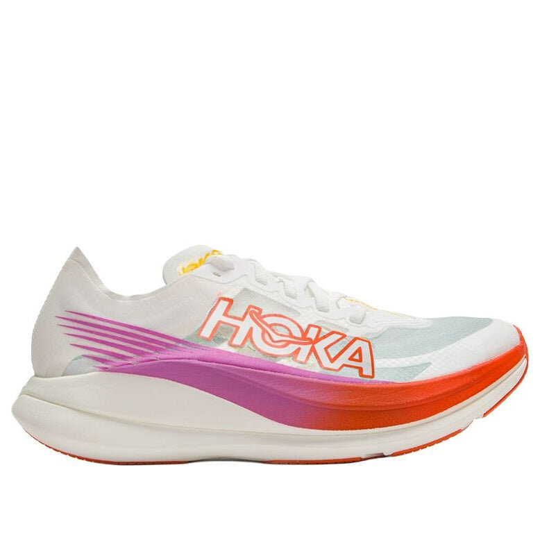 Conquer your marathon with the HOKA Rocket X 2. Its PROFLY-X™ midsole delivers a cushioned landing and responsive takeoff, enhanced by a full-length carbon plate for stability and propulsion. A breathable mesh upper and durable outsole with superior grip complete this high-performance running shoe. Set new personal bests!