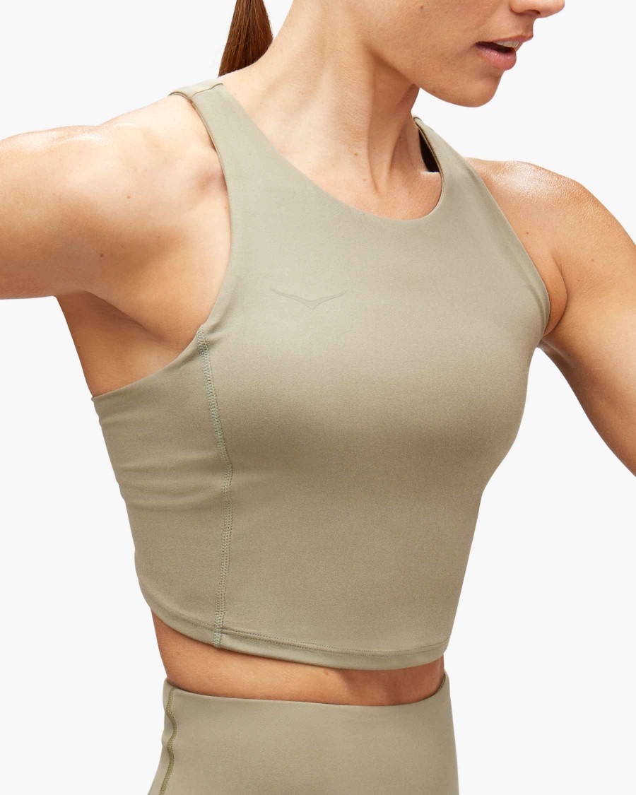 75% recycled polyester/elastane/BioWick materialShelf bra with encased elastic for low impact supportRemovable soft cupsReflective bird and HOKA heat transfer logoRN 88276